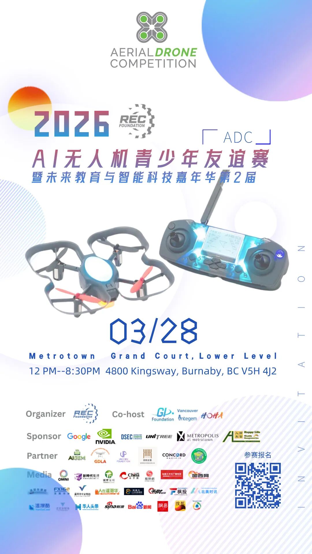 2026年3 月 28 日,REC‑AI 无人机青少年友谊赛(ADC)暨未来教育与智能科技嘉年华第二届,在加拿大 BC 省最大的大的商场Metrotown盛大举办。本次活动由GI Foundation、Vancouver Integem、HOHA Creative 联合主办,财富人生财富管理有限公司荣誉赞助支持。本次活动吸引了各界嘉宾与机构参与,来自不同学校与机构的青少年选手、教育专家、政府代表及业界嘉宾,共同见证这一科技与教育的盛事。
